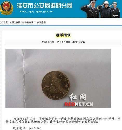 這則5毛錢招領(lǐng)告示系江蘇省淮安市淮陰公安分局所發(fā)。啟示稱,“王營(yíng)鎮(zhèn)小學(xué)六一班學(xué)生蔡卓樾在西馬路口撿到一枚硬幣,交給了正在西馬路口執(zhí)勤的交警,請(qǐng)失主迅速帶身份證件到我局領(lǐng)取”。啟示上還附有照片,一枚銹跡斑斑的5毛錢硬幣,靜靜躺在照片里。據(jù)悉,這是他們根據(jù)上級(jí)的要求,作為政府信息公開(kāi)的具體實(shí)施步驟,通過(guò)互聯(lián)網(wǎng)發(fā)布失物招領(lǐng)信息。記者搜索到5毛錢硬幣頁(yè)面已被刪除。不過(guò),能通過(guò)“快照”看到。