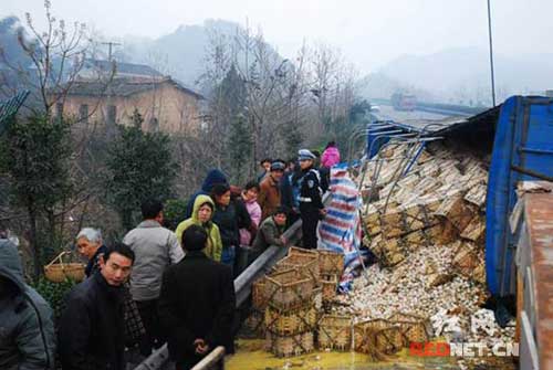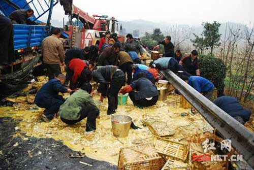 1月4日早晨6時(shí)40分,一輛滿載7噸鮮鴨蛋的湖北小貨車,由北往南行駛至京珠高速高速公路長(zhǎng)潭段212公里時(shí),因躲避快速車道的一輛汽車超車側(cè)翻,10萬(wàn)多只鴨蛋傾覆在近8米長(zhǎng)的高速公路路肩上。附近近百村民聞?dòng)嵡皝?lái)哄搶,現(xiàn)場(chǎng)一片狼藉。