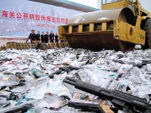 近日,在汕頭海關(guān)舉行的公開銷毀走私仿真槍現(xiàn)場(chǎng)會(huì)上,43款共計(jì)42762支仿真槍和配套塑料BB彈9.6噸被壓路機(jī)碾壓銷毀。