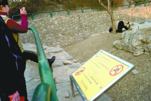 動(dòng)物園工作人員表示,鑒于動(dòng)物園曾發(fā)生過游客跳入大熊貓運(yùn)動(dòng)場(chǎng)被咬事件,園方已安排動(dòng)物展示時(shí)專人看護(hù),并在多處多角度設(shè)置了警示牌、提示牌。