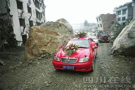 元旦節(jié),一對北川新人,經(jīng)過特許,駕著婚車橫穿北川縣城遺址進(jìn)行了一場特殊的婚禮。