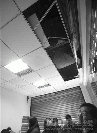 記者看到,店鋪柜臺上還留有幾個(gè)腳印,腳印上方的天花板,是一個(gè)2米見方的大窟窿,而在“大窟窿”上面,還有垂直相連的另外2個(gè)大洞,透過三個(gè)窟窿,可以直接看到房頂外面的天空。