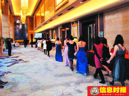 1月10日晚,備受關(guān)注的廣州史上最昂貴的“世紀(jì)佳緣.名仕之約”相親會,終于揭開了神秘的面紗,在廣州一家五星大酒店里,從6000多名報(bào)名者中脫穎而出的40名美女,嚴(yán)冬之下穿著單薄、靚麗的晚禮服,邁著貓步,擺出媚態(tài),供30名鉆石王老五們鑒賞。[1月11日[[信息時報(bào)]]]