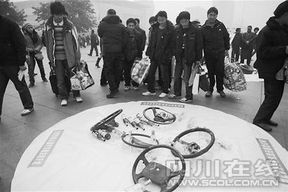 近百個(gè)酒瓶圍成一個(gè)圈,中間堆放著被撞變形的機(jī)動(dòng)車方向盤,每個(gè)方向盤都來(lái)自一起帶血的車禍。民警還將紅色油漆涂在方向盤上,讓人感覺像噴出的“鮮血”……另一組“行為藝術(shù)”,是“限速60公里/小時(shí)”的標(biāo)志牌下,橫七豎八堆放著幾個(gè)變形的汽車輪胎。每一個(gè)輪胎上分別寫著時(shí)速110公里、140公里、150公里……“這些車輪也分別來(lái)自一起起慘烈的車禍。”民警說(shuō)。 看了兩組行為藝術(shù),過往旅客紛紛感嘆“太直觀、太震撼了!”