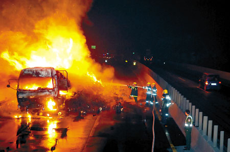 昨天是春運第一天,記者在京珠高速粵北段采訪時,恰好目睹一輛大貨車自燃的全過程。事故純屬偶發(fā),但救援中暴露出的一些問題,可以說是給今年的春運敲響了警鐘———