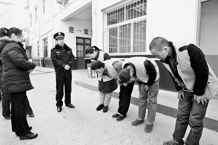 4個(gè)騙子昨日站在辛家廟派出所的院子里,面對受害人大梅悲憤的責(zé)問,一起給大梅深深地鞠躬表示道歉。