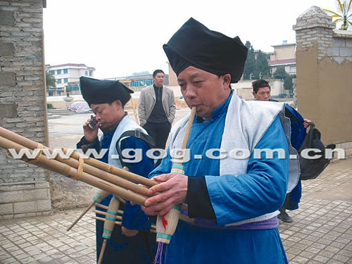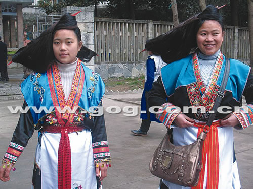 記者看見(jiàn),穿戴盛裝的男子們均身穿青藍(lán)色的長(zhǎng)衫,外加一件白色的小褂。據(jù)稱,這件小褂名為旗幟褂,上面還繡有夜郎王印,穿戴旗幟褂,這與祖先們打仗有關(guān),他們頭上戴的用黑布包裹的帽子有五個(gè)角,看上去讓人頓生威嚴(yán)之感(如圖);而夜郎美女們穿戴的是一套漂亮的有各種色調(diào)的衣裙,據(jù)她們說(shuō),這叫七江裙,上面記錄有他們的祖先約3000多年前遷徙的歷史。而最令人注目的,還是這些夜郎美女們的發(fā)型。只見(jiàn)她們的頭上均插了一根約兩尺長(zhǎng)的竹片,長(zhǎng)長(zhǎng)的頭發(fā)繞著竹片使頭發(fā)在右側(cè)成了一個(gè)半弧形(如圖)。她們告訴記者,這種發(fā)型也是竹王崇拜的一種。
