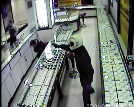 現(xiàn)場(chǎng)錄像顯示,當(dāng)晚7時(shí)20分30秒,一歹徒手持鐵錘,將一柜臺(tái)的玻璃敲碎,將里面的金屬飾品物品放進(jìn)手提包;5秒后,持槍歹徒在一個(gè)角落用槍托狠砸店主何先生頭部;14秒后,珠寶店兩名工作人員趁亂逃離現(xiàn)場(chǎng);29秒后,手捂頭部的何先生欲離開(kāi)現(xiàn)場(chǎng),被歹徒喝令退回,歹徒上前用手槍再次砸傷何先生頭部,并在店內(nèi)慌亂走動(dòng);51秒后,持鐵錘歹徒先逃離現(xiàn)場(chǎng),持槍歹徒緊跟欲逃離;54秒后,持槍歹徒被民警制服。