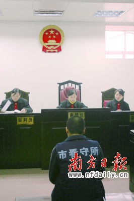 由于關(guān)押疑犯的廣州市第三看守所距離海珠區(qū)法院較遠,運送疑犯的警車10時許才到達法院,原定于9時30分開庭的此案于10時11分正式開庭。疑犯黃新在進入審判庭之時,露出短暫的笑容。