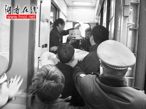 昨日下午4時40分,株洲火車站原定?慷九_的廣州開往成都的K193次列車緩緩駛進一站臺。站臺上,從一輛早已等候在此的救護車上,醫(yī)生、民警和患者家屬合力抬下一副擔架登上列車。擔架上躺著一名戴著呼吸機、處于重度昏迷的患者。