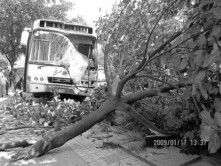 記者在柯子嶺公交站事故現(xiàn)場看到,由黃石路到珠江泳場的36路公交車撞上了路基,橫臥在人行道上,旁邊綠化帶一棵直徑20厘米左右的大樹被攔腰撞斷,幾近覆蓋人行道。肇事車令該路段嚴(yán)重受阻,行車排成長龍緩慢通過,交警在場指揮交通,幾名工作人員在挪斷樹,吊正肇事車輛。