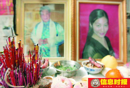 走進(jìn)屋里,首先映入眼簾的是阿瑩和峰哥兩個(gè)人的大鏡框遺照,擺放在房門左側(cè)一張桌子上,前面燒滿了香!斑@個(gè)靈堂是阿瑩親手布置的,原本是作為峰哥的靈堂,阿瑩死之前偷偷做了一張同樣大小的遺照,然后把遺照放在上面,讓它變成了兩個(gè)人共同的靈堂!