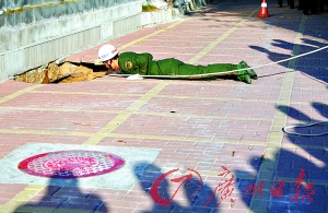 據(jù)現(xiàn)場(chǎng)消防官兵介紹,下陷的大坑有七八米深,因?yàn)槭掳l(fā)地段為填海而成,加上旁邊有施工工地,泥沙流失可能是其下陷原因,擔(dān)心路面出現(xiàn)更大面積下陷,消防救援官兵所開(kāi)來(lái)的專業(yè)吊車(chē)一時(shí)不敢靠近洞口。