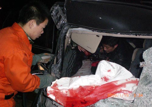 凌晨3時14分,接到報警后,漯河源匯區(qū)消防大隊特勤中隊中隊長彭中明立刻帶領(lǐng)一部搶險救援車10余名隊員火速趕往事故現(xiàn)場。距離現(xiàn)場50米外,就能看到一列長長的火車停在南環(huán)路中間,把進入漯河市區(qū)內(nèi)的幾條主要通道牢牢堵死,造成進出漯河的幾輛汽車無法通行。來到事故現(xiàn)場,只見一輛小轎車的車頭被撞得面目全非,擋風玻璃被撞碎,車前的引擎蓋被撞得凸了出來,一名40多歲的司機滿臉是血,嘴里不停地發(fā)出微弱的呻吟聲。由于他的雙腳被卡在變形的車體內(nèi),現(xiàn)場的交警經(jīng)過多次努力最終沒能將其救出。