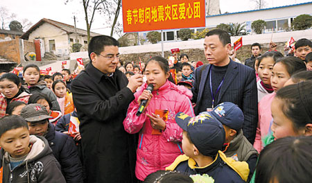 昨日下午,陳光標率領(lǐng)由全國63位企業(yè)家組成的“春節(jié)慰問地震災(zāi)區(qū)愛心團”,來到德陽市中江縣龍臺鎮(zhèn),在龍臺中學(xué)和蘭渡小學(xué)開展慰問活動。