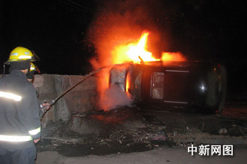 中新網(wǎng)瑞安1月24日電(記者袁爽 通訊員余根鈴)24日凌晨,在浙江瑞安市經(jīng)濟(jì)開發(fā)區(qū)濱江大道與東港路交叉口處發(fā)生了驚險的一幕。一個急轉(zhuǎn)彎,一輛北京現(xiàn)代越野車失控,撞上圍墻側(cè)翻并冒出滾滾濃煙,隨后冒出火苗,車子系統(tǒng)失靈,車門打不開,從天窗上爬出3男1女,攔下出租車,往醫(yī)院趕去。