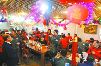 吃得高興的老外紛紛向中國(guó)同行們拜年,生硬的中國(guó)話“中國(guó)新年好”,在食堂里此起彼伏。
