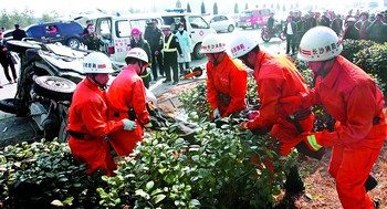 10多分鐘后,接警的消防戰(zhàn)士、解放軍163醫(yī)院的醫(yī)務(wù)人員、望城縣交警大隊的交警趕到了事故現(xiàn)場。消防戰(zhàn)士迅速用工具切割車體,將車內(nèi)傷員救出,醫(yī)務(wù)人員將傷員迅速送往醫(yī)院。由于節(jié)后返程的車輛大增,交通一度堵塞。交警迅速疏導(dǎo)交通,3名當(dāng)?shù)氐闹伟碴爢T也馬上投入到搶救傷員之中,一臺從岳陽返回廣東的吉普車路過,見此情景,一名警察也跳下車來幫助疏導(dǎo)交通,當(dāng)?shù)夭簧俅迕衽浜辖痪谑鹿尸F(xiàn)場設(shè)置警戒線……車禍現(xiàn)場雖然慘烈,但軍警民生死大營救有條不紊地進行。