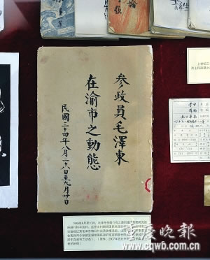 今年正值中共中央南方局成立70周年,紅巖革命紀(jì)念館展出了一本泛黃的手抄本,封皮上赫然寫著:參政員毛澤東在渝市之動態(tài)。紅巖聯(lián)線文化發(fā)展管理中心主任厲華透露,該書系60多年前敵特對毛澤東的監(jiān)視記錄,該館花18.5萬元在北京拍得。