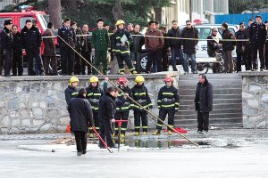 事發(fā)現(xiàn)場,吞噬了年輕男子的冰窟緊靠敬業(yè)湖南岸。公安、消防人員將敬業(yè)湖緊鄰北洋道一側(cè)的湖岸封鎖,7個民警沿著親水平臺走上冰面,用竹竿在冰下摸索著。時間一分一秒地過去,救援人員找來一塊長方形木板,當(dāng)作筏子艱難地破冰搜救。一個半小時過去了,救人的“筏子”漸漸向湖心移動,搜索的竹竿在一米一米地加長,但水下沒有一點(diǎn)動靜。