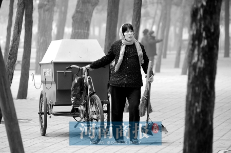 梁廣英說的是她的月工資。她在鄭州城西的碧沙崗公園做清潔工,已經(jīng)有兩個月時間。不過,她不直接受雇于公園管理處,每月250元的工資,是由公園一名姓趙的清潔工給她開的。她幫他干活。