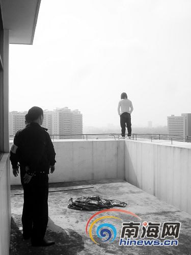 2月5日,阿春聽(tīng)從記者的勸說(shuō),當(dāng)天就從?诜祷嘏R高的家里。結(jié)果,家人與阿春大吵了起來(lái)。阿春在家里呆不住,于2月6日中午從臨高趕到?,隨即來(lái)到?谀仙陈芬粭澊髽堑臉琼,站在樓頂?shù)倪吘墱?zhǔn)備跳樓自殺。