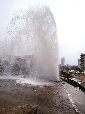 “先是聽到吱吱吱地響,馬上要到10點時,突然‘砰’的一聲后,一股水柱就沖上天了。”60多歲的黃婆婆當時在現(xiàn)場,據(jù)她介紹,沖天水柱有人的大腿粗細,“起碼有十多米高。”