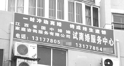 按廣告牌上的聯(lián)系電話,記者找到了位于南昌市三店西路的這家“試離婚”服務(wù)中心———江西省國中婚姻家庭咨詢服務(wù)有限公司。該中心就設(shè)在一家律師事務(wù)所里面。