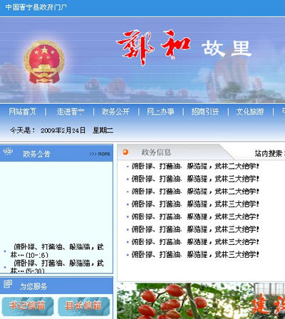 24日晚10時,記者在晉寧縣政府門戶網(wǎng)站()上看到,網(wǎng)站首頁充斥著幾十行“俯臥撐、打醬油、躲貓貓,武林三大絕學!”的字樣,公示公告、政務信息、領導講話、政務文件、政策法規(guī)、統(tǒng)計數(shù)據(jù)、招商引資、文化旅游等欄目原有的內(nèi)容都被替換成“俯臥撐、打醬油、躲貓貓,武林三大絕學!”。除了一些圖片無法刪改外,所有的文章標題、圖片的注釋也都被改為以上字樣。