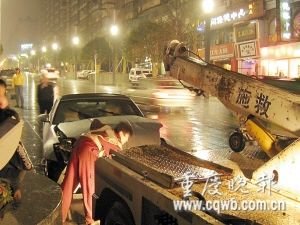 目擊者劉先生介紹,9時50分左右,當(dāng)事尼桑跑車從北城天街方向飛馳著上行,駛向江北歐式一條街。在歐式一條街中段,尼桑失控,撞向路邊的路燈電桿。“砰”的一聲響后,電桿“巍然不倒”,尼桑車卻來了個180度的大轉(zhuǎn)彎。當(dāng)晚10時10分左右,記者在現(xiàn)場看到,這輛車牌號為渝AE3183的尼桑跑車車頭被撞得四分五裂,路面上散落著車燈,鐵皮等碎片。目擊者劉先生說,事發(fā)后,車上兩人毫發(fā)無損,但下車后不知去向。