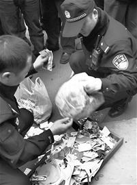 上午10時40分,警方將老人從樓上扔下的錢、名片、光盤等東西一一收拾好帶走,以作進一步調查。