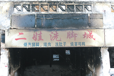 昨日,記者在九坑子農(nóng)貿(mào)市場(chǎng)中找到了這家“最牛洗腳城”,由于該地段即將拆遷,該店鋪內(nèi)早已空無(wú)一人,但“二娃洗腳城”的招牌依然高掛在這家僅10平米大小的店門(mén)前,在這片凌亂的地方,顯得十分醒目。