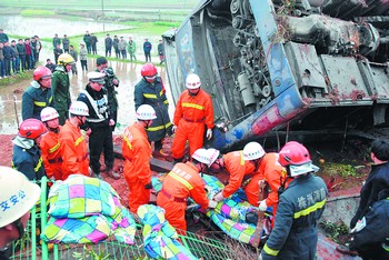 附近村民聞?dòng)嵑,也紛紛趕來協(xié)助交警救人。但由于近來連續(xù)降雨,護(hù)坡非常濕滑,給救援工作帶來了極大困難。官兵們采用了救生繩施救的辦法,將兩根救生繩拴在護(hù)欄上,利用救生繩往路面運(yùn)送擔(dān)架上的傷員。至上午8時(shí)30分,全部傷員被救出并送往醫(yī)院救治。11時(shí)40分,事故車輛被拖離出事地點(diǎn),為實(shí)施救援而實(shí)行交通管制的京珠高速株洲段恢復(fù)正常通車。