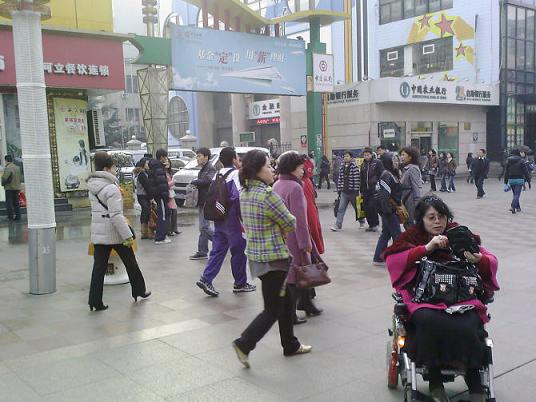 “救救這個(gè)22歲的新娘子吧,謝謝你的愛(ài)心!睔埣踩藙⒈淖妱(dòng)輪椅在青島市區(qū)為白血病新娘高俊峰奔走呼告,籌集“善款”。
