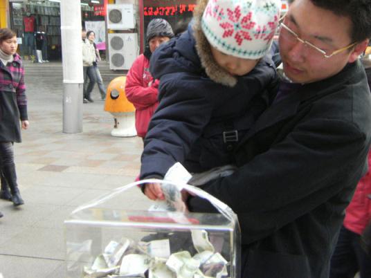 “我和我的好姐妹王靜一起,在青島市區(qū)準(zhǔn)備組織這次捐款活動(dòng)!眲⒈恼f(shuō),“開(kāi)始的時(shí)候由于城管管理的比較嚴(yán)格,所以只能通過(guò)市北區(qū)紅十字會(huì)協(xié)調(diào),最后允許我們的捐款活動(dòng)可以組織兩天。”