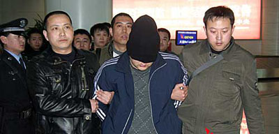 據(jù)了解,3月13日晚上,由“3.08”特大搶劫殺人案專案指揮部派遣的13名辦案民警,乘坐火車趕赴滿洲里。14日上午,民警們從滿洲里公安局看守所將這3名犯罪嫌疑人押出,乘坐飛機押解回呼。當日16時許,記者來到呼和浩特白塔國際機場。記者注意到,3名犯罪嫌疑人的頭上都被蒙上了頭套,無法看出他們的長相。這3人的個子并不高,其中1人比較胖,另兩人都較瘦小,能夠看得出他們的年齡并不大。雖然他們打扮成學(xué)生模樣,但是他們的穿著還是引起了大家關(guān)注,因為他們都身著嶄新的阿迪達斯牌的上衣和褲子,腳上穿的也是阿迪達斯牌的鞋子。據(jù)民警講,這衣服是他們逃亡到北京后用搶劫到手的錢購買的。