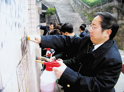 手拿刷子、噴水槍和抹布,公務(wù)纏身的書(shū)記、縣長(zhǎng)親自動(dòng)手清除城市“牛皮癬”。3月13日,一網(wǎng)友在大渝網(wǎng)三峽吧發(fā)出的帖子《云陽(yáng)書(shū)記縣長(zhǎng)走上街頭清除“牛皮癬”何需親歷親為?》,引發(fā)網(wǎng)友熱議。有網(wǎng)友不解,書(shū)記和縣長(zhǎng)何必在百忙之中對(duì)此“小事”親歷親為。從山東到云陽(yáng)交流任職的云陽(yáng)縣委書(shū)記李洪義昨日介紹說(shuō),云陽(yáng)縣正在創(chuàng)建國(guó)家衛(wèi)生縣城,他希望通過(guò)自己的行為,號(hào)召大家一起關(guān)心城市環(huán)境。