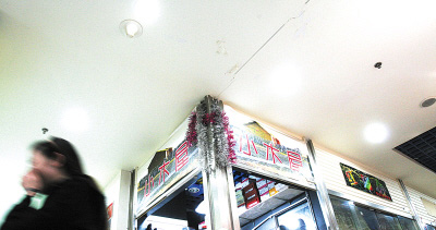 昨日中午,記者在現(xiàn)場發(fā)現(xiàn),其主要通道和許多門市的墻面上開始清晰地出現(xiàn)大小不一的裂縫!案杏X像每天都在經(jīng)歷地震。”大坪金象世家地下商場C區(qū)105號商戶趙庭明指著頭頂附近的一條裂縫說,前天上午,巨響突然傳來,一位恰巧經(jīng)過的老太以為發(fā)生地震嚇得當(dāng)即蹲倒在地。