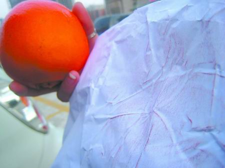 “網(wǎng)友們說,有些商販為了讓橙子色澤更漂亮、賣相更好,就把色素注射到橙子皮里,再在皮上打些石蠟,使橙子看起來很新鮮,但這樣的橙子會‘掉色’!痹S女士說,她用紙蘸了些水,在還沒食用的橙子上擦拭,“紙變成紅的了,我又用手去擠剝下來的橙子皮,流出來的水也是紅的!