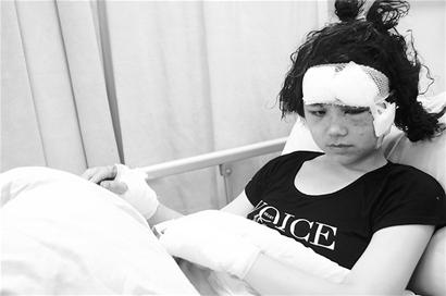 昨日上午9點半,在華西醫(yī)院急診科,馮曉蘭的兩名女同學正為她打理頭發(fā)。被鮮血浸透,頭發(fā)凝結(jié)成了一塊,根本無法梳理。經(jīng)過幾天的治療,馮曉蘭的傷勢已明顯好轉(zhuǎn),但紅腫的雙眼及面部的瘀痕依然清晰可見,緊裹紗布的雙手至今還不能動彈。她說,由于身體還處在恢復期,這些天來,起居都是由同學輪流照顧。
