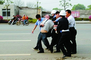 據(jù)陳勇介紹,昨日下午4時,他正在中南大學(xué)新址的拆遷現(xiàn)場采訪。當時,有拆遷戶拉著橫幅,與數(shù)十名身著城管和聯(lián)防制服的男子對峙!皠傞_始還算平靜”,不多時,五六名穿制服者圍毆一名拆遷戶。