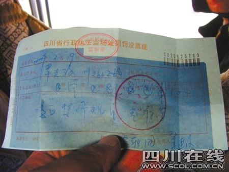 19日上午10時(shí)許,仁壽縣城區(qū)書(shū)院街,倪師傅正騎著新買的三輪車。一輛沒(méi)有牌照的長(zhǎng)安之星警車,突然停在他面前,從車上下來(lái)兩個(gè)身著交警協(xié)警員制服的男子:“你的車不能進(jìn)城,過(guò)來(lái)接受處理!蹦邘煾到忉屨f(shuō):“警官,我是來(lái)給車上牌照的,交警大隊(duì)在城里,我必須進(jìn)城啊!薄吧僬f(shuō)這些,違反了規(guī)定就要罰款。本來(lái)罰200元,念你是初犯,交100元就是了。”隨即,坐在該車駕駛室里的一名身著交警制服的中年男子開(kāi)了一張100元的罰款單據(jù),倪師傅最終只得無(wú)奈地交了罰款。
