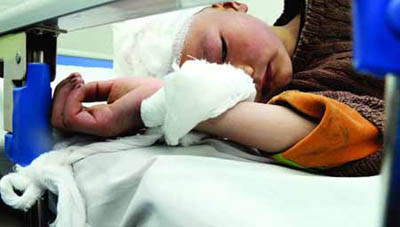 另一個(gè)受害孩子的家長楊旗中正趴在ICU病房的門口,兒子楊自炎剛動(dòng)完腦部手術(shù)。為了防止孩子亂動(dòng),兩只小手被捆在了床旁的護(hù)欄上。