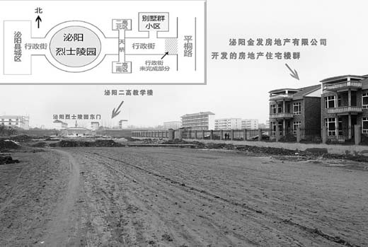 從空間位置上看,由金發(fā)房地產(chǎn)開發(fā)公司所建的住宅樓在烈士陵園東側約1公里的地方,中間間隔了泌陽縣第二高中校園。住宅樓及別墅區(qū)并沒有侵占烈士陵園土地。