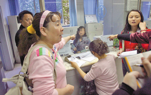 昨日上午9點(diǎn)半,醫(yī)療保險(xiǎn)管理中心渝中區(qū)分中心二樓接待大廳內(nèi)人頭攢動(dòng),在一號(hào)窗口前排隊(duì)等待辦理業(yè)務(wù)的市民多達(dá)14人,但隊(duì)伍卻不曾向前移動(dòng)半步。因?yàn)橐惶?hào)窗口內(nèi)根本不見(jiàn)工作人員的身影,這些市民從上午9點(diǎn)開(kāi)始已經(jīng)守著空窗排了半小時(shí)。