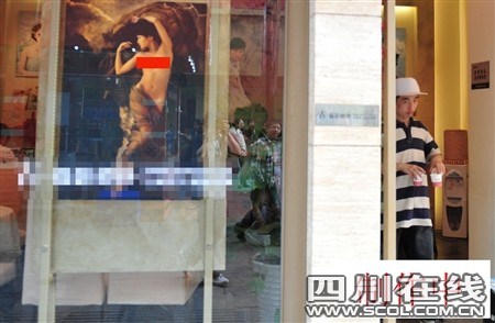 這家攝影店位于春熙路南口,在臨著步行街的一排商鋪中。店門(mén)口一扇巨大的落地玻璃櫥窗里,掛著兩幅照片,其中一幅就是侯女士提到的那幅裸照。照片大約有80厘米高、60厘米寬,照片上的長(zhǎng)發(fā)女子上半身正面全裸,下半身也只有一層薄紗遮蓋。路過(guò)的路人中,有不少人的目光都會(huì)在這幅照片上停留。