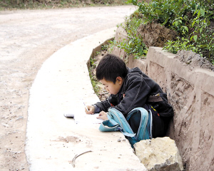 “他不被路過的汽車、行人而影響,以溝為凳子,公路路沿為桌子,認真地寫著作業(yè)!弊蛱欤浾哒业搅司W(wǎng)友“情緣”發(fā)布的《公路邊寫作業(yè)的娃》。因為已有超過1400次的點擊和50余人次的回復,該帖子已被版主“置頂”。帖子中貼出了6張圖片:一段崎嶇彎道旁,一名身材矮小的小男孩正蹲在公路排水邊溝中,佝僂著身體,做作業(yè)。旁邊還有一個藍色書包和課本。