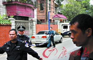 昨日中午,記者趕到現(xiàn)場(chǎng),高為5層的33號(hào)大門(mén)緊閉,院內(nèi)站滿民警,門(mén)前排了11輛警車(chē)。記者觀察發(fā)現(xiàn),距離33號(hào)不到100米就是廣州最為繁華的地帶之一——五羊新城內(nèi)的達(dá)道路,路上車(chē)輛穿梭往來(lái),周邊分布著廣州各大單位。距離33號(hào)大院的路對(duì)面,成排的老別墅被重新裝修一新,里面駐扎著數(shù)間公司,營(yíng)業(yè)范圍有廣告、律師等行業(yè),白天人流不少。
