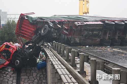 今天凌晨,一輛金華牌照的大掛車在經(jīng)過衢州與常山交界處附近的芳村溪大橋時(shí),車輛忽然發(fā)生側(cè)翻,掛車車頭撞壞中央護(hù)欄伸出橋外,掛車車身橫向?qū)⑼鞣较蜍嚨廊孔钃,事故車輛上裝載有硫酸、氫氟酸等多種危險(xiǎn)品,其中部分危險(xiǎn)品發(fā)生泄露。