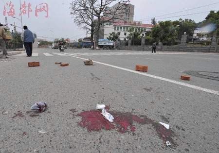 記者趕到現(xiàn)場時,老人剛被送往醫(yī)院,路面上滿是血跡。警方正在用磚頭圍著的事故現(xiàn)場勘查!爱敃r那名老人從分院走出來,過斑馬線時,一輛摩托車從他后面撞了上去!币荒繐粽哒f,那輛“黑色,很新”的摩托車速度很快,“老人被撞得飛起,在地上滾了幾下,躺在路上呻吟著,頭上、腳上都是血。”